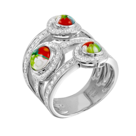 Rhodium Plated 925 Sterling Silver 3 Row 3 Round Murano Glass CZ Ring - MR00003
