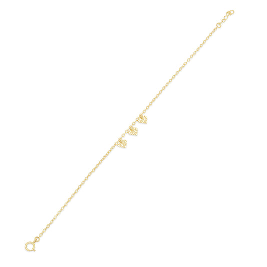 14KB0012. - 14 Karat Yellow Gold Three Diamond Cut Heart Charm Adjustable Bracelet