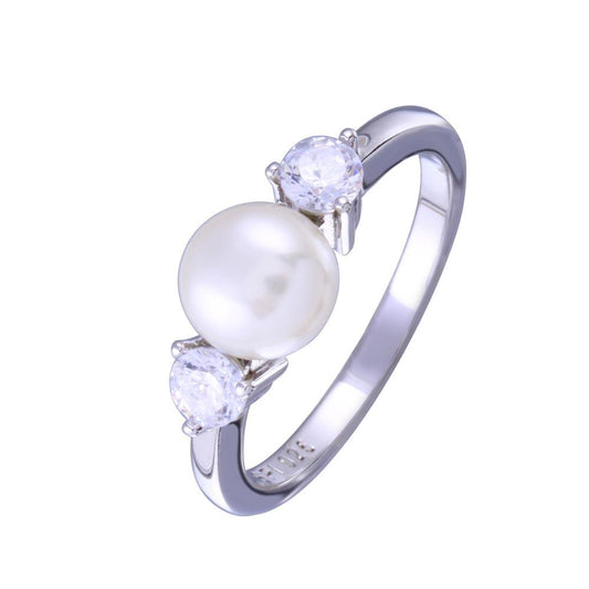 Rhodium Plated 925 Sterling Silver Freshwater Pearl with Clear CZ Ring - STR01159