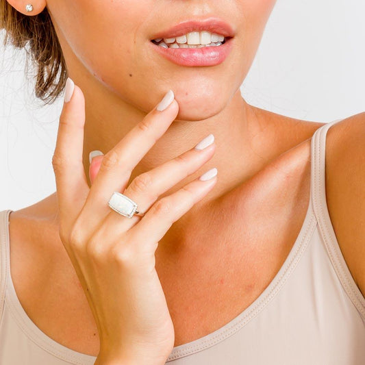 Rhodium Plated 925 Sterling Silver Rectangular Opal Stone Ring with CZ - BGR01286