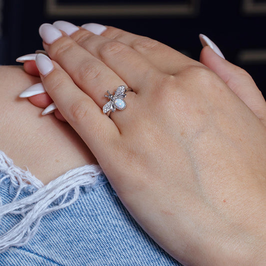 Rhodium Plated 925 Sterling Silver Simulated Opal Bee Ring - BGR01355