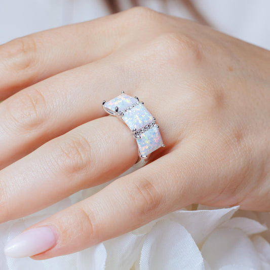 Rhodium Plated 925 Sterling Silver Triple Square Synthetic Opal CZ Ring - BGR01305