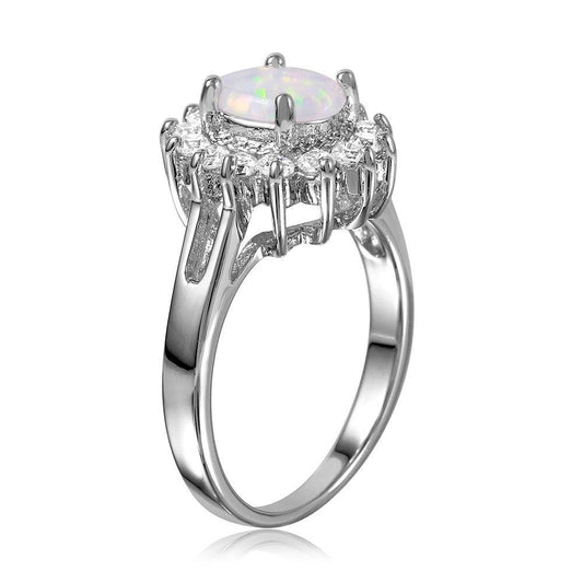 Silver 925 Rhodium Plated Oval Halo Ring with Synthetic Opal Center Stone - BGR01027