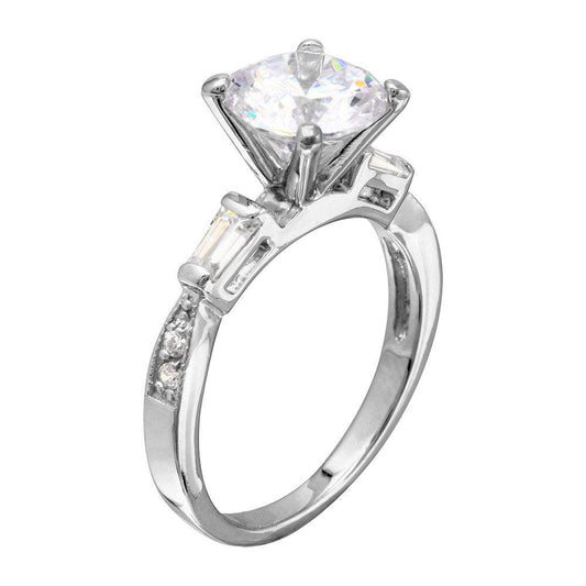 Silver 925 Rhodium Plated Round Center Clear Baguette CZ Bridal Engagement Ring - BGR00455