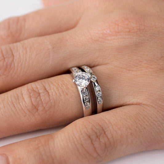 Silver 925 Rhodium Plated Round Pave Center Trio Bridal Ring - GMR00162