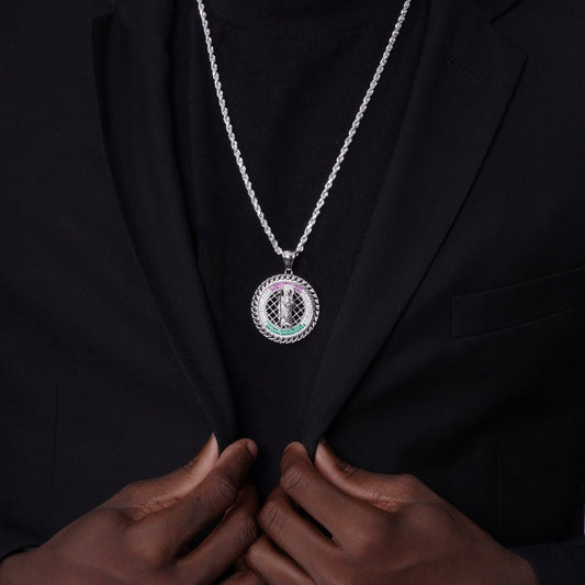 Rhodium Plated 925 Sterling Silver Saint Jude Clear Green and Red CZ 35mm Pendant - SLP00358