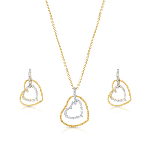 Clearance-Gold Plated 925 Sterling Silver Double Heart Dangle CZ Sets - STS00138