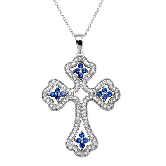 Silver 925 Rhodium Plated Blue CZ Designed Cross Necklace - BGP01273BLU