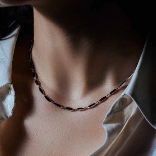Rhodium Plated 925 Sterling Silver Onyx Cat's Eye Link Necklace - BGP01484