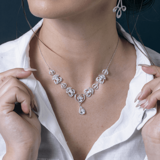 Rhodium Plated 925 Sterling Silver Victorian Hearts Teardrop Clear CZ Necklace - STP01841