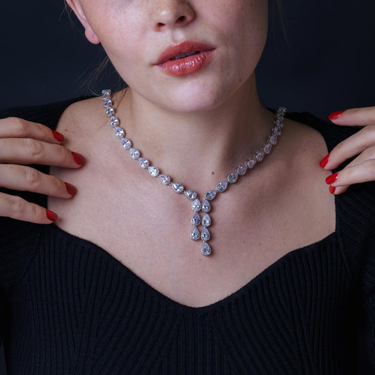 Rhodium Plated 925 Sterling Silver Teardrop Clear CZ Tennis Necklace - STP01850