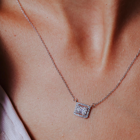 Rhodium Plated 925 Sterling Silver Round Baguette CZ Square Necklace - GMN00200
