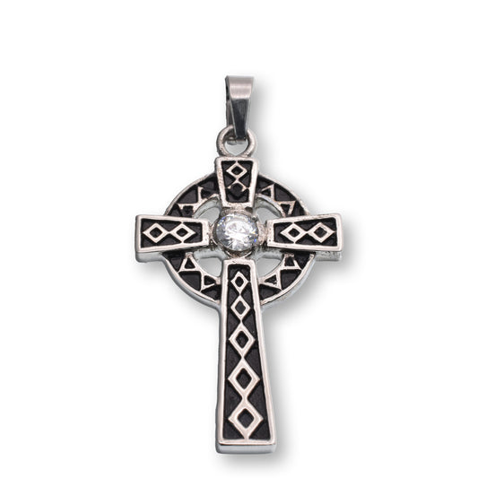 Black and Silver Tone Stainless Steel Celtic Cross CZ Center Stone and Diamond Pattern 25.1mm x 38.1mm Pendant - SSP00286