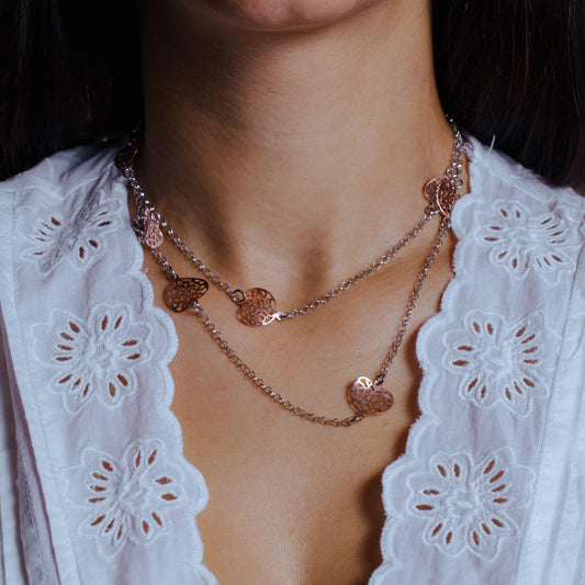 Silver 925 Rose Gold and Rhodium Plated Curvy Holed Heart Long Necklace - ITN00072
