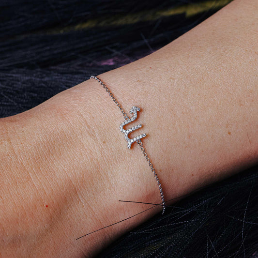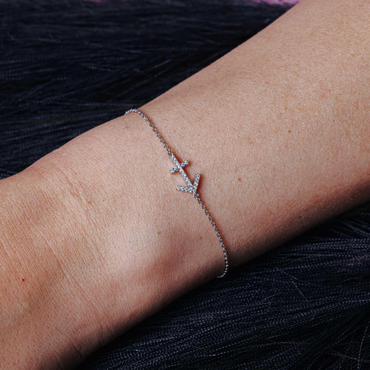 Rhodium Plated 925 Sterling Silver Sideways Cross Bracelet with CZ - BGB00115