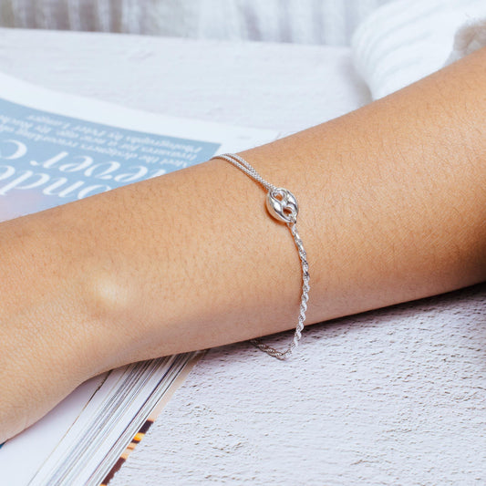 Rhodium Plated 925 Sterling Silver Puffed Mariner Charm Double Strand Curb and Paperclip Adjustable Bracelet - ITB00329-RH