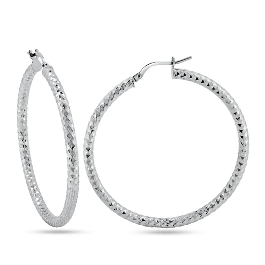 Rhodium Plated 925 Sterling Silver 3mm Diamond Cut Textured Hoop Earrings - ARE00037RH