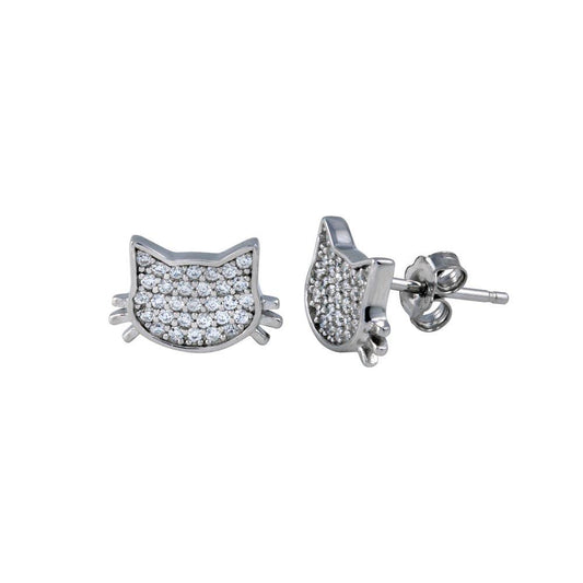 Rhodium Plated 925 Sterling Silver Cat Clear CZ Stud Earring - BGE00729