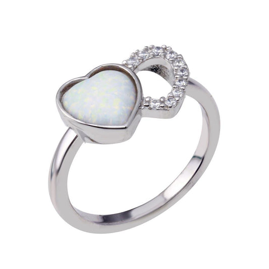Rhodium Plated 925 Sterling Silver 2 Open Heart Simulated Opal and Clear CZ Ring - BGR01354