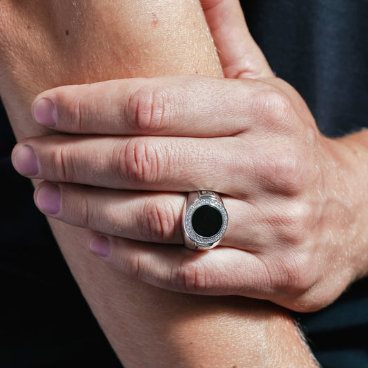 Rhodium Plated 925 Sterling Silver Men's Round Flat Round Onyx Ring with CZ - GMR00254RH