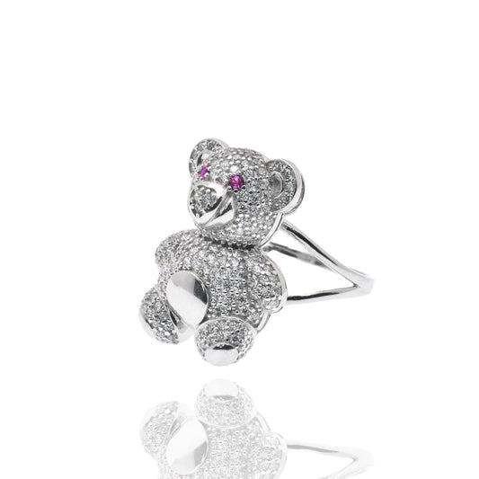 Rhodium Plated 925 Sterling Silver Teddy Bear Red and Clear CZ 17mm x 22mm Ring - PAR00447