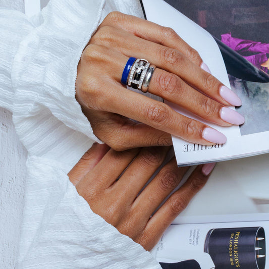 Silver 925 Rhodium Plated Blue Enamel Fleur De Lis Eternity Ring - STR00526