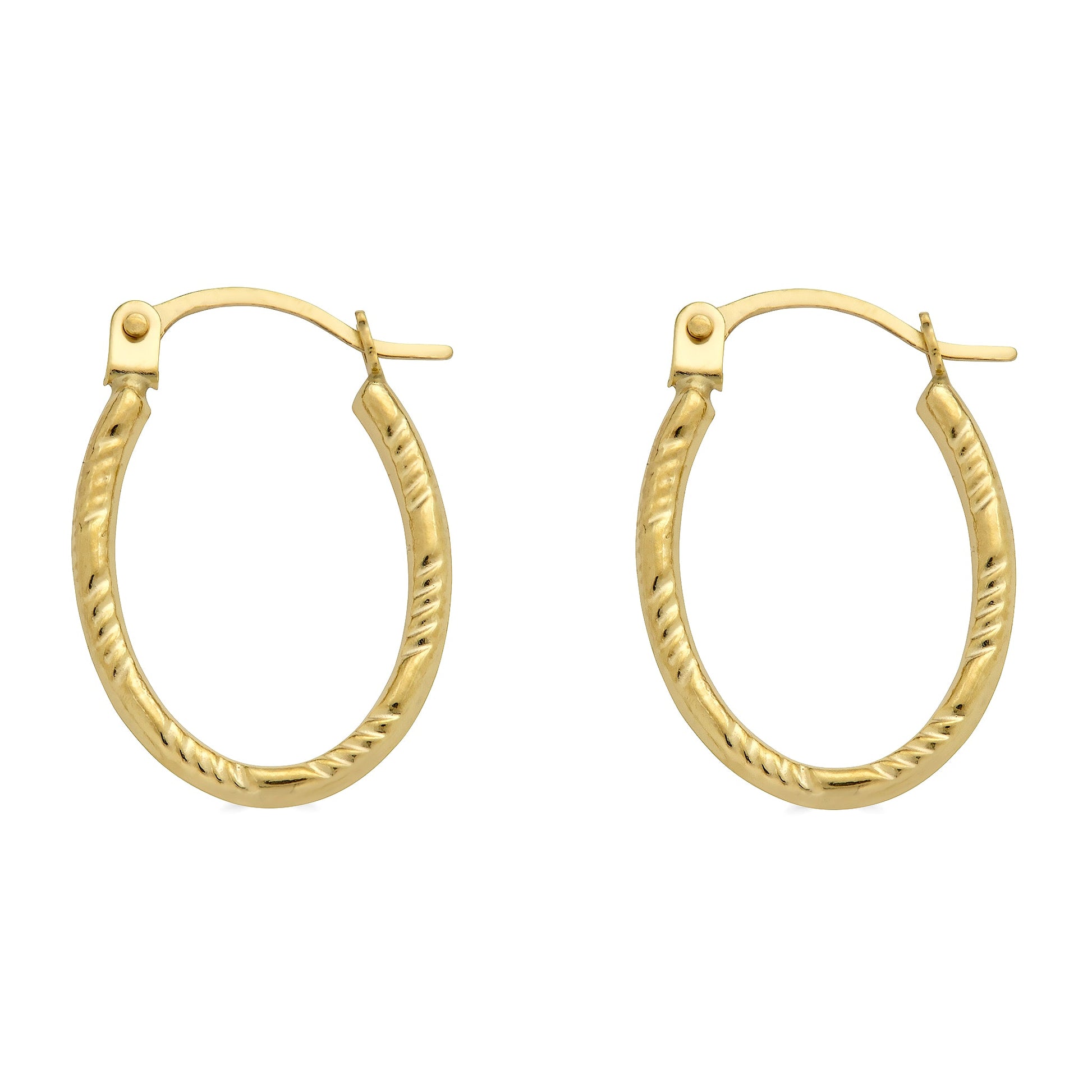 14E00385. - 14 Karat Yellow Gold Diamond Cut Textured Oval Hoop Latch Lock Earrings