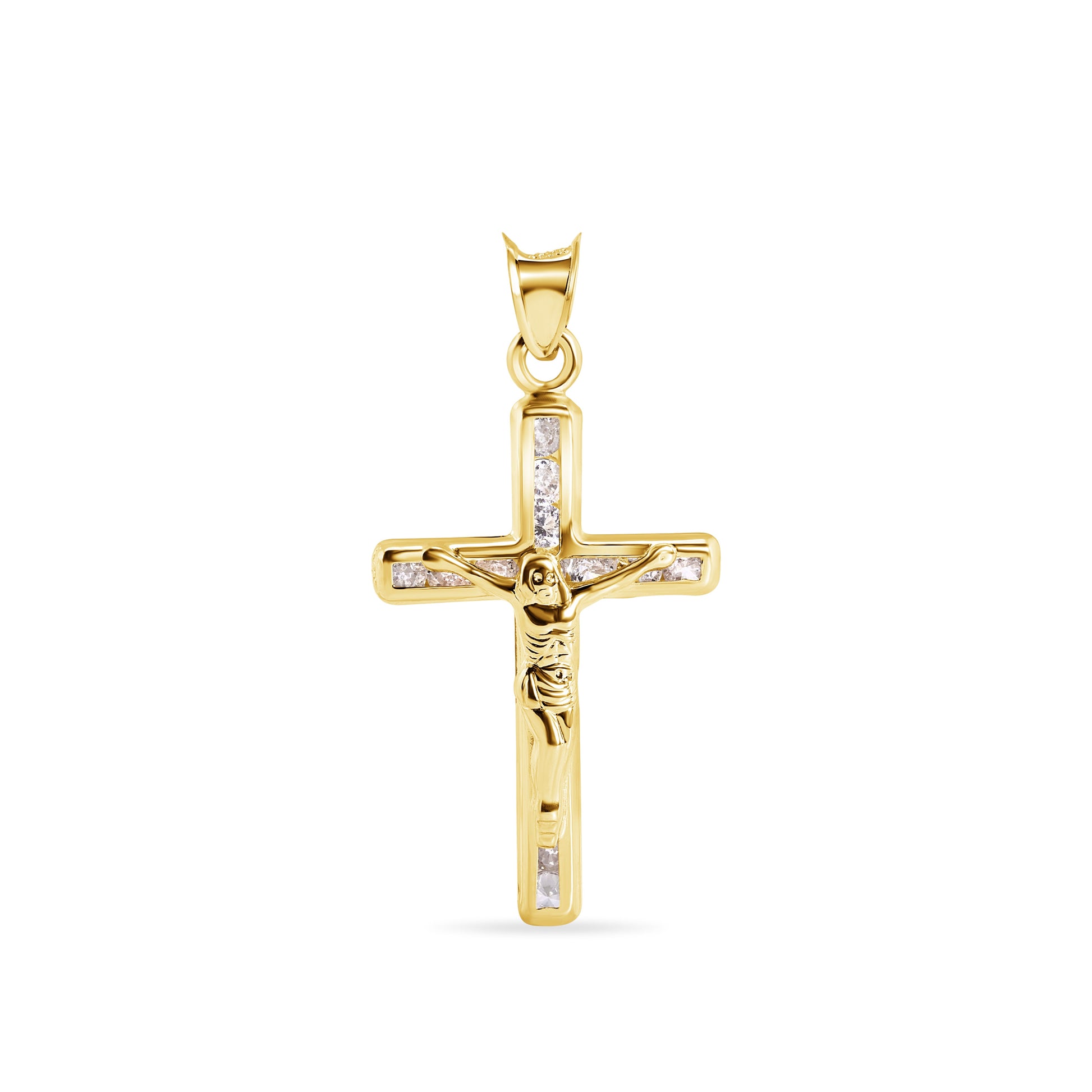 14P00144. - 14 Karat Yellow Gold Cross Jesus Christ Clear CZ Pendant