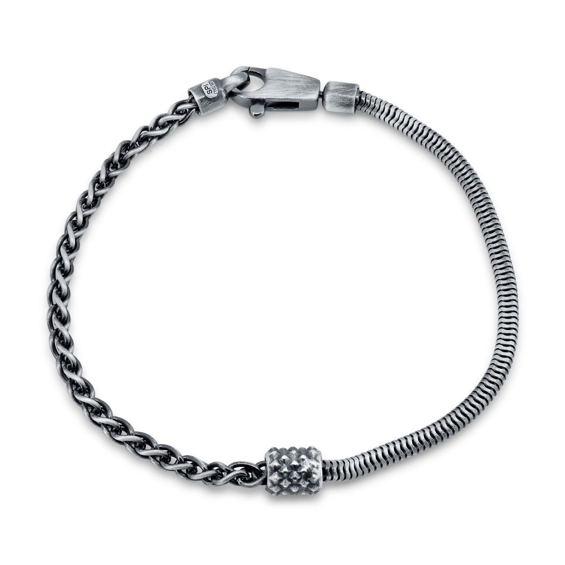 The gun metal plating gives the bracelet a sleek and edgy appearance, adding a touch of modernity to the classic sterling silver look. The half round snake chain links add texture and flexibility to the bracelet, while the half wheat chain links provide a sophisticated and intricate pattern.