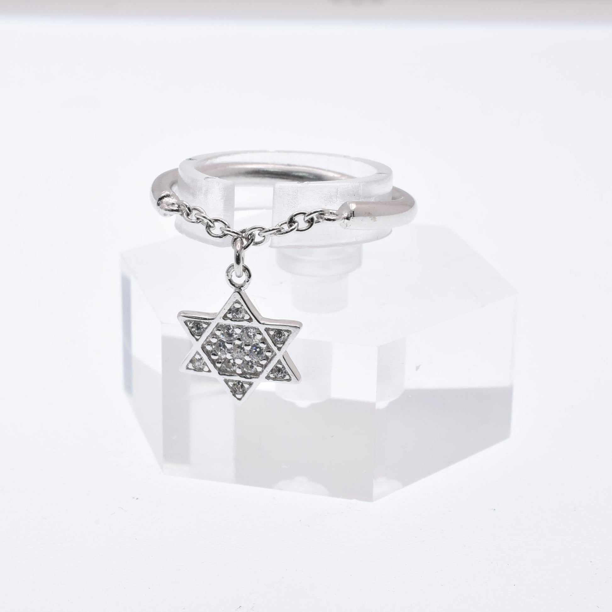 925 Sterling Silver Nickel Free Rhodium Plated Half Ring Chain Dangling Star of David Clear CZ Ring - STR01013