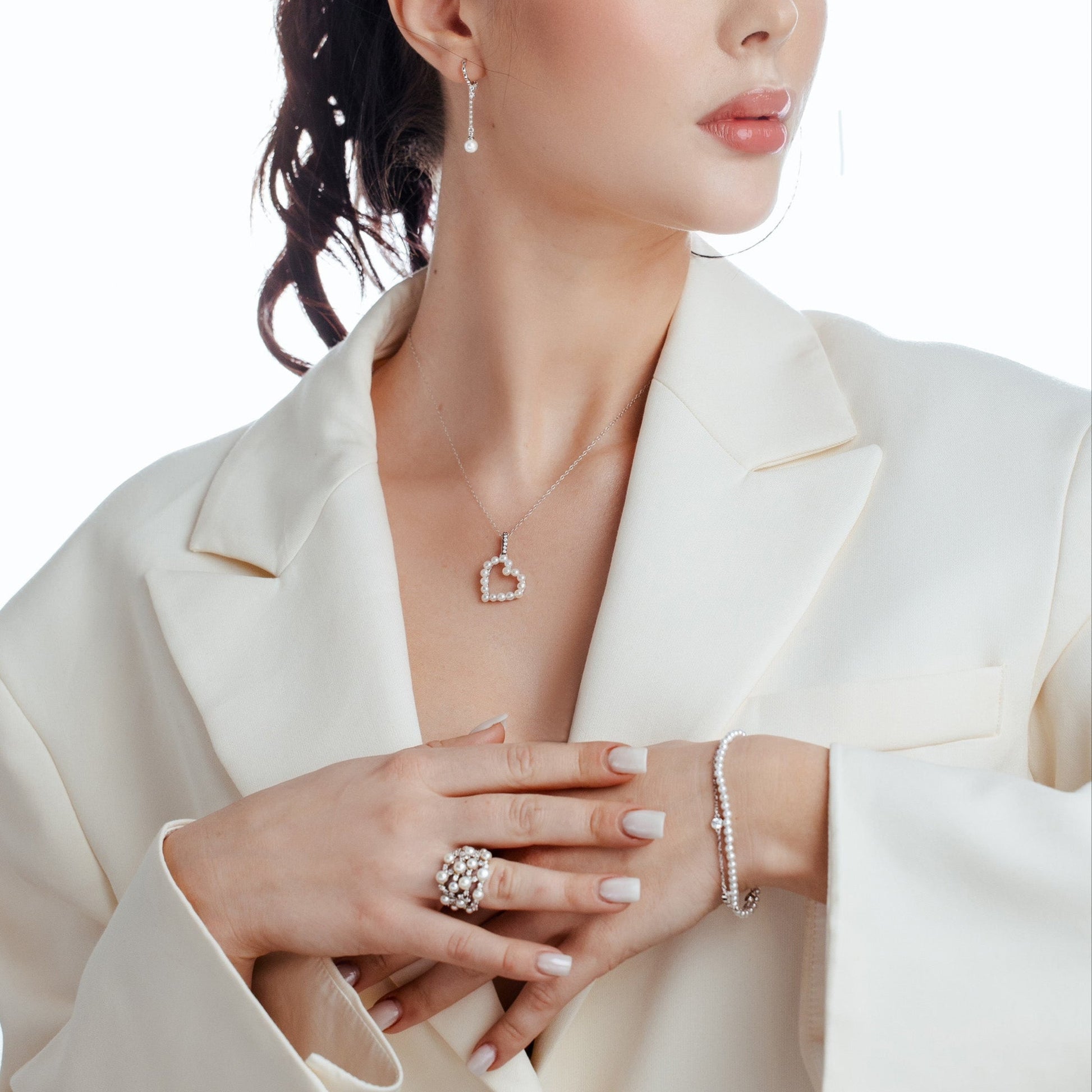The 925 Sterling Silver Rhodium Plated Pearl Heart Necklace is a beautiful piece of jewelry designed for women. The necklace is made of 92.5% pure silver, which is known as sterling silver. The silver is rhodium plated, which adds a bright and shiny finish to the necklace and also helps to protect it from tarnishing and scratches.