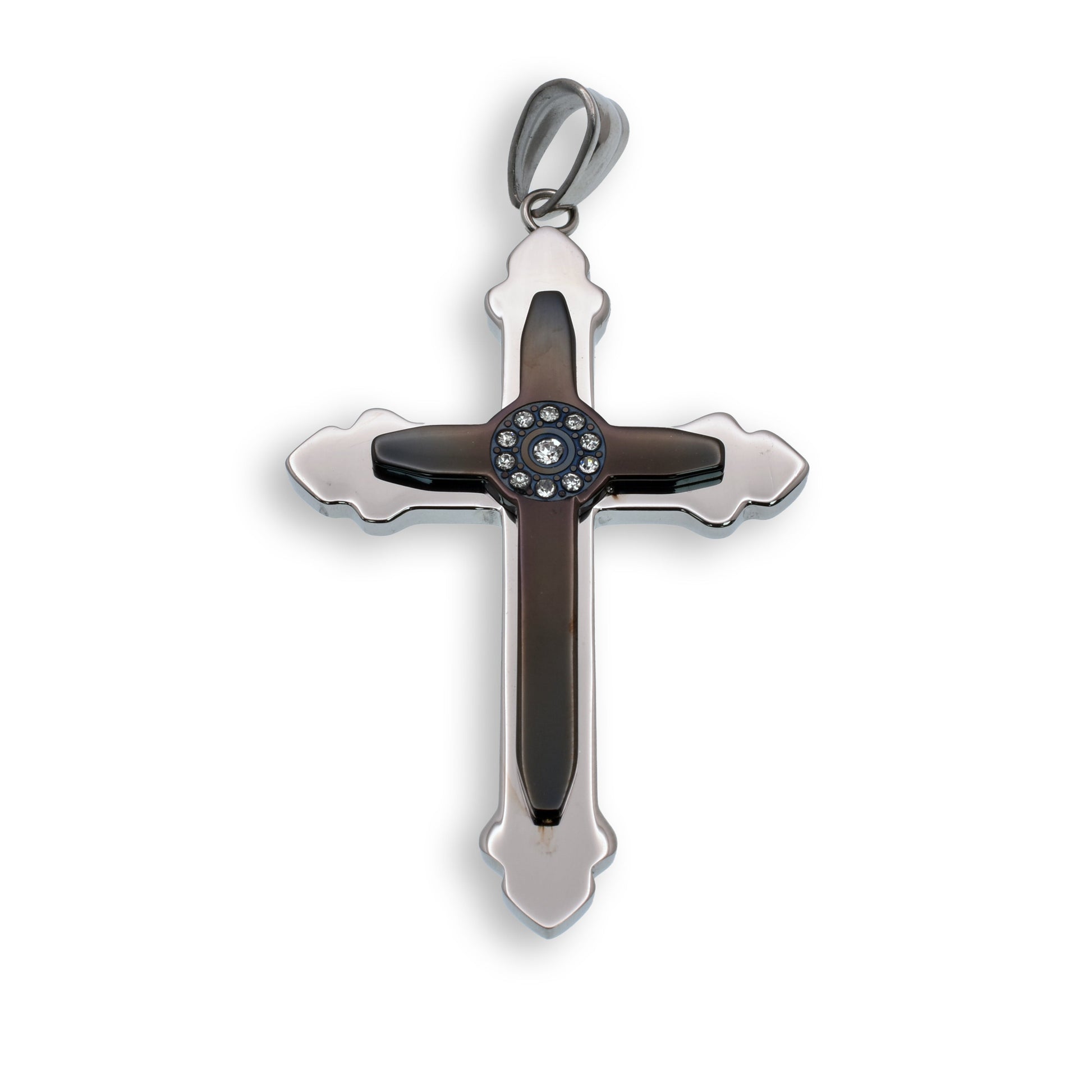 Black & Rhodium Plated Stainless Steel Double Layered CZ Cross Pendant - SSP00143