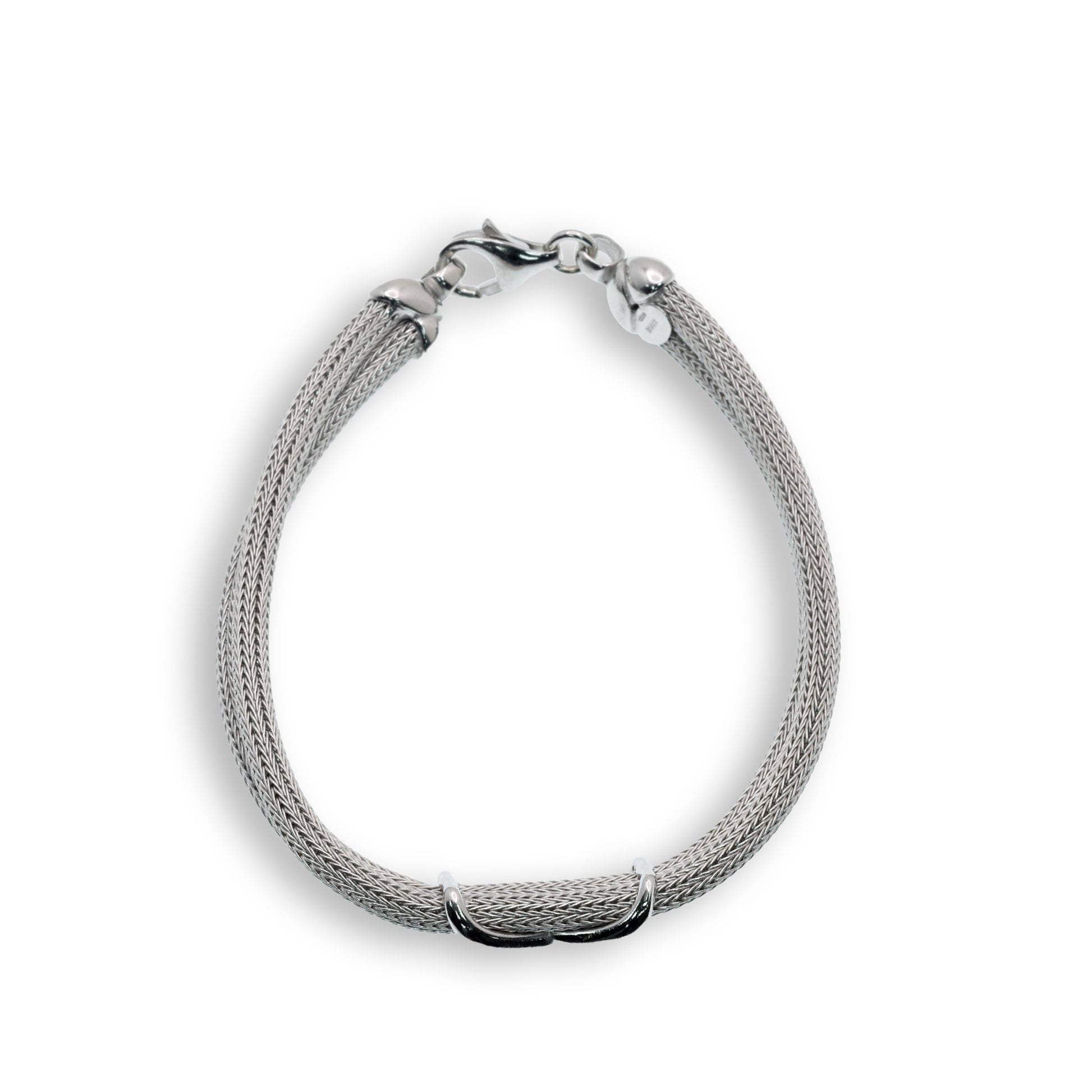 Crafted from high-quality rhodium-plated metal, this Italian bracelet features a unique X accent weave design. Expertly crafted and perfect for any occasion, it adds a touch of elegance to any outfit. Now available at a discounted price, this bracelet is a must-have for any jewelry lover.