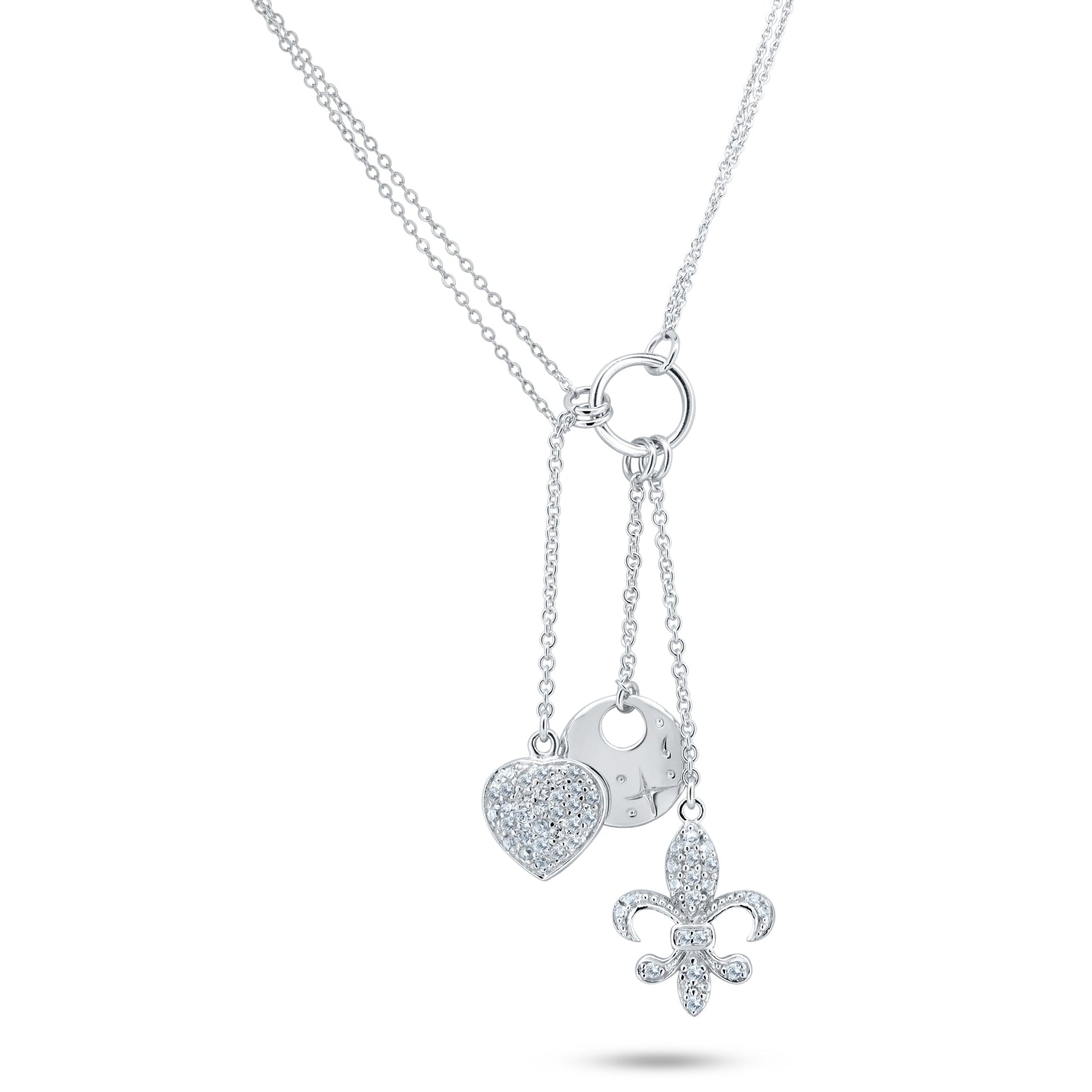 Clearance-Rhodium Plated 925 Sterling Silver Clear CZ Flor De Lis, Heart, Disc Charm Necklace - STP00850