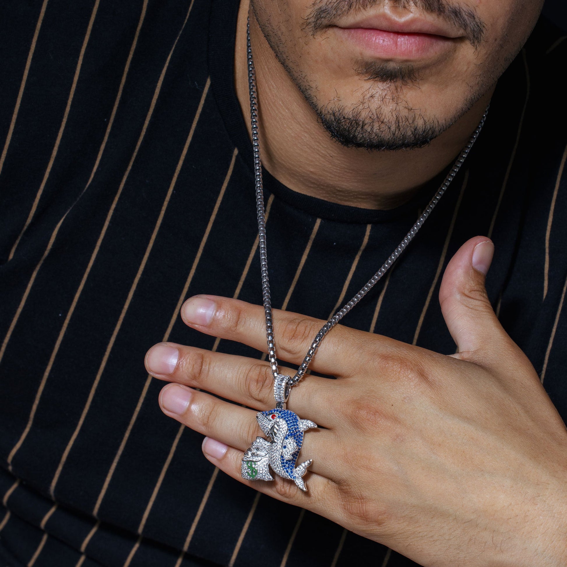 Add a touch of luxury to your style with our Silver 925 Rhodium Plated Money Bag Shark Greed Clear and Blue CZ Pendant. Crafted with high-quality materials, this sleek and elegant pendant features a shimmering shark design adorned with clear and blue CZ stones. Perfect for making a statement and showing off your sophisticated taste.