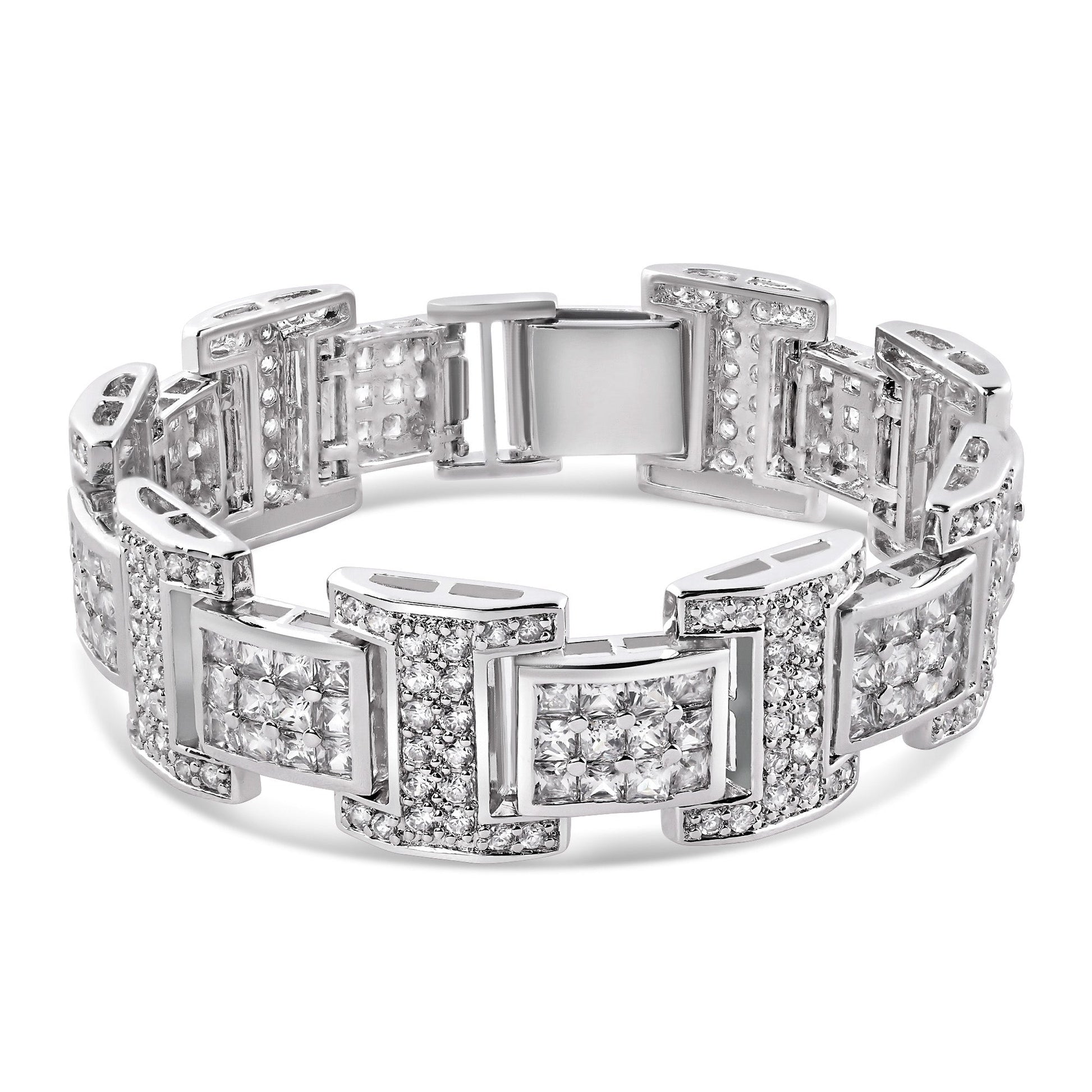Men's Rhodium Plated 925 Sterling Silver Link Clear Square and Round CZ Studded 20mm Bracelet - STBM0040
