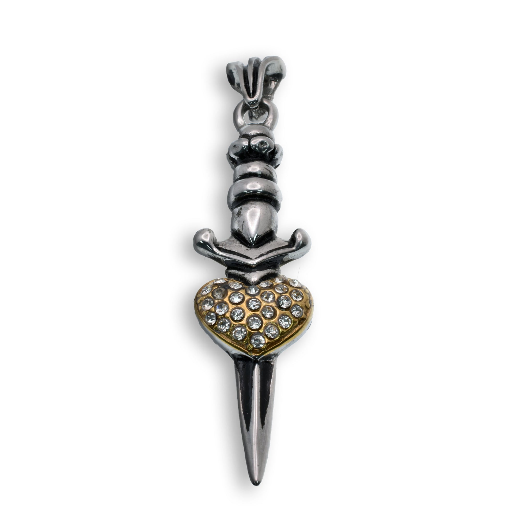 Oxidized and Gold Plated Stainless Steel Dagger Heart Gothic Edgy Design Clear CZ 15.2mm x 56.6mm Pendant - SSP00303