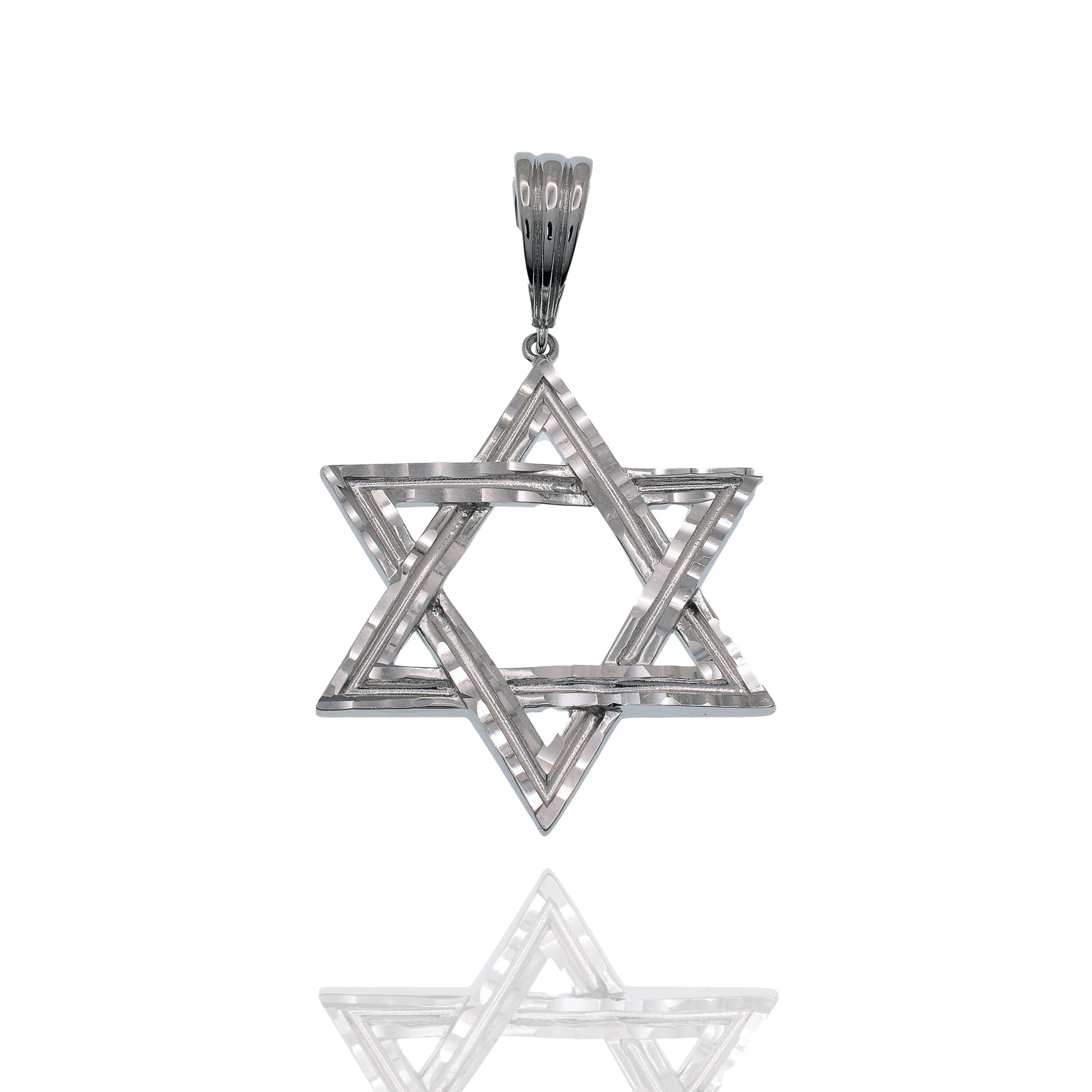 Crafted from premium 925 sterling silver with a protective rhodium plating, this 34mm Star of David pendant features precise diamond-cut detailing that enhances light reflection for exceptional brilliance. The meticulous craftsmanship ensures both religious significance and sophisticated elegance, making it an ideal piece for daily wear or special occasions.