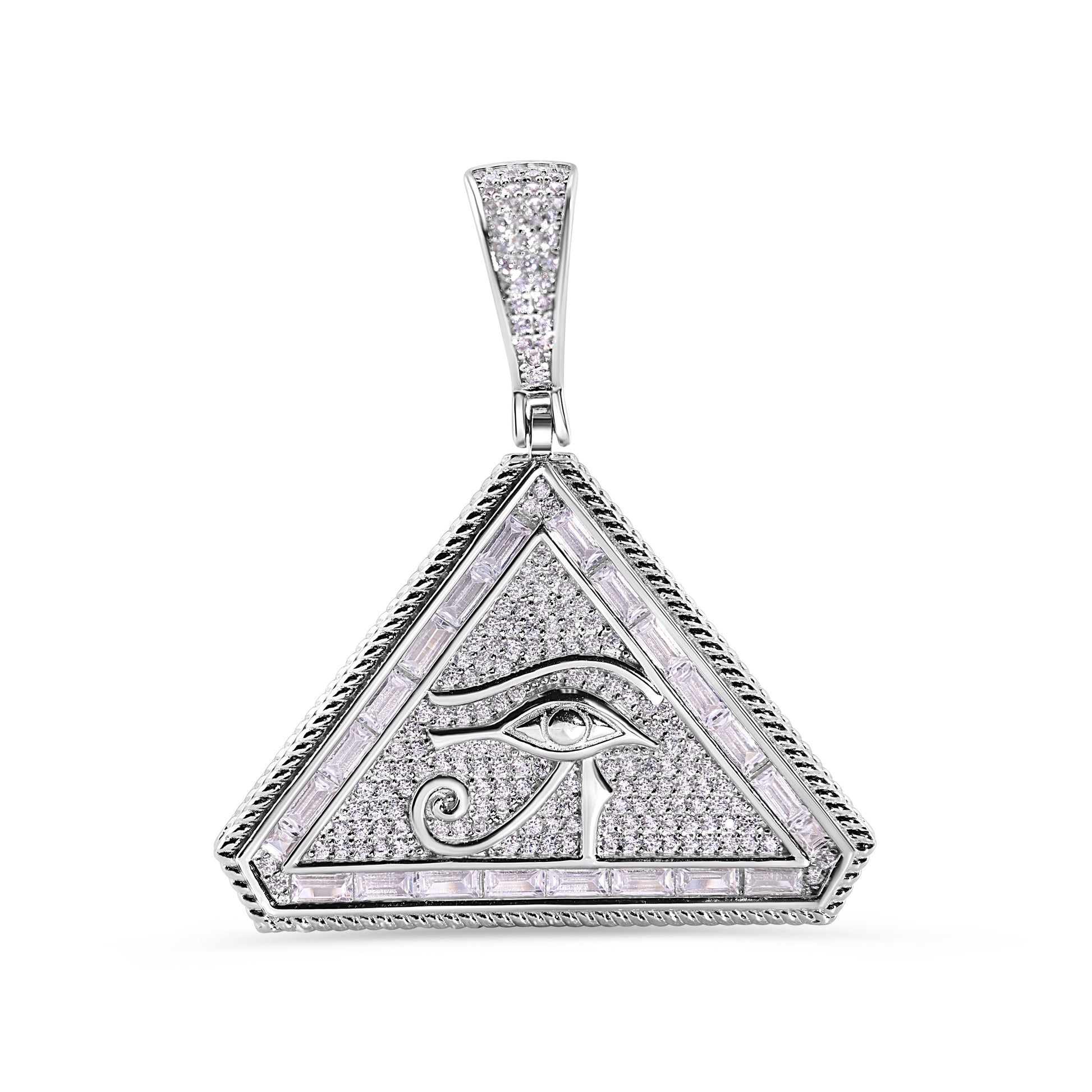 Rhodium Plated 925 Sterling Silver Eye of Horus Triangle Clear Baguette and Round CZ Pendant - SLP00437