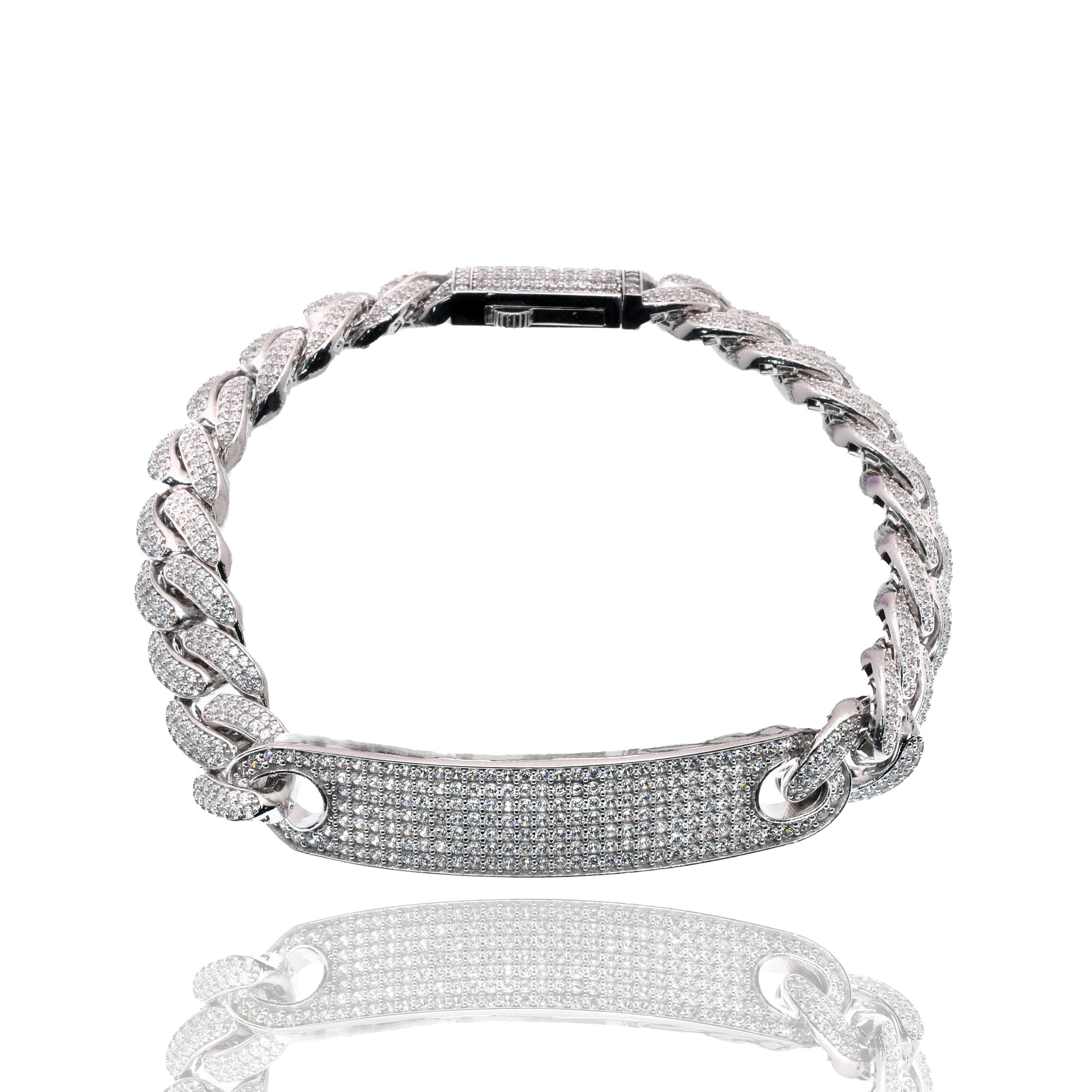Expertly crafted with durable rhodium plated 925 sterling silver, this Cuban link bracelet features a unique ID design and is iced out for a touch of luxury. The 10.6mm width adds a bold statement to any outfit. Elevate your style with this stunning piece of jewelry.
