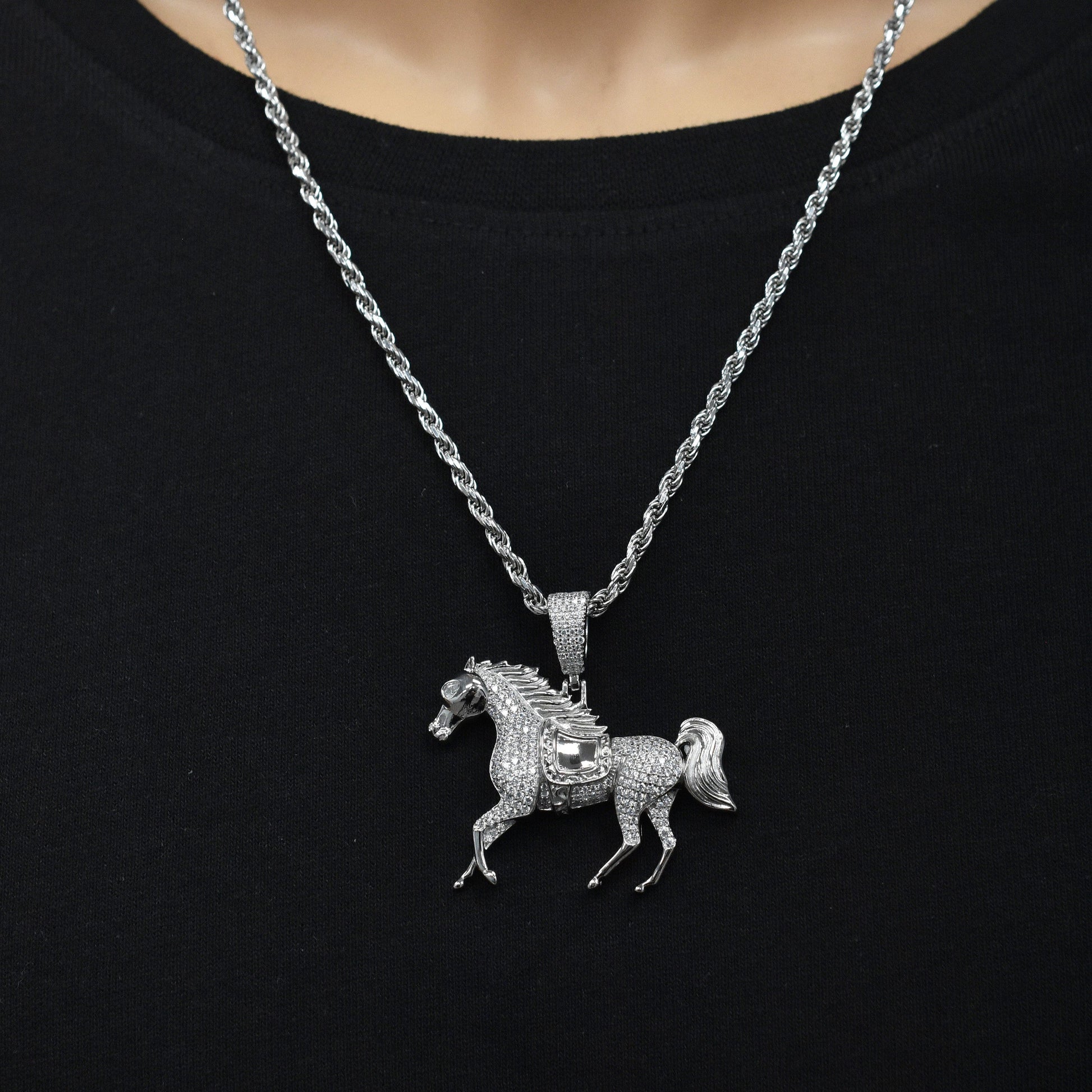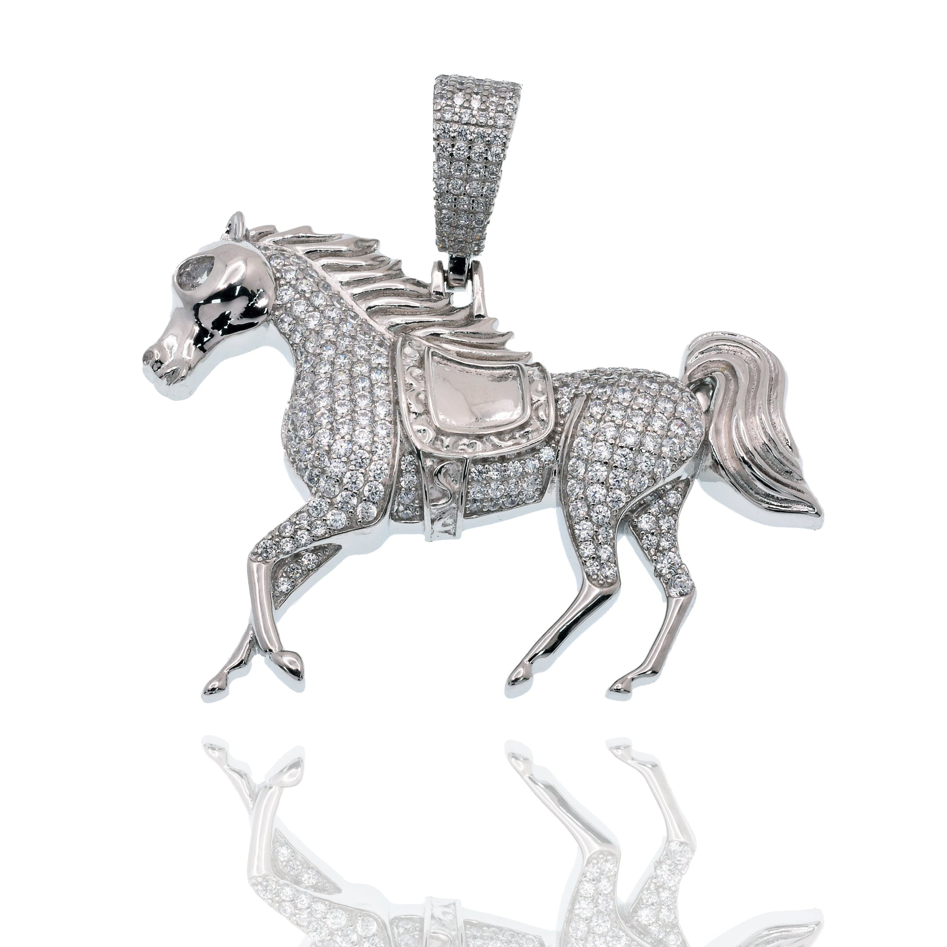 This striking Rhodium Plated 925 Sterling Silver pendant features an intricately designed horse silhouette completely embellished with premium clear cubic zirconia stones in a luxurious "iced out" setting. Measuring an impressive 42mm x 30mm, this statement piece offers substantial presence and exceptional brilliance. The rhodium plating provides superior tarnish resistance while enhancing the pendant's reflective properties, ensuring long-lasting luster. Expertly crafted for equestrian enthusiasts who appreciate fine jewelry with meticulous attention to detail and superior craftsmanship.
