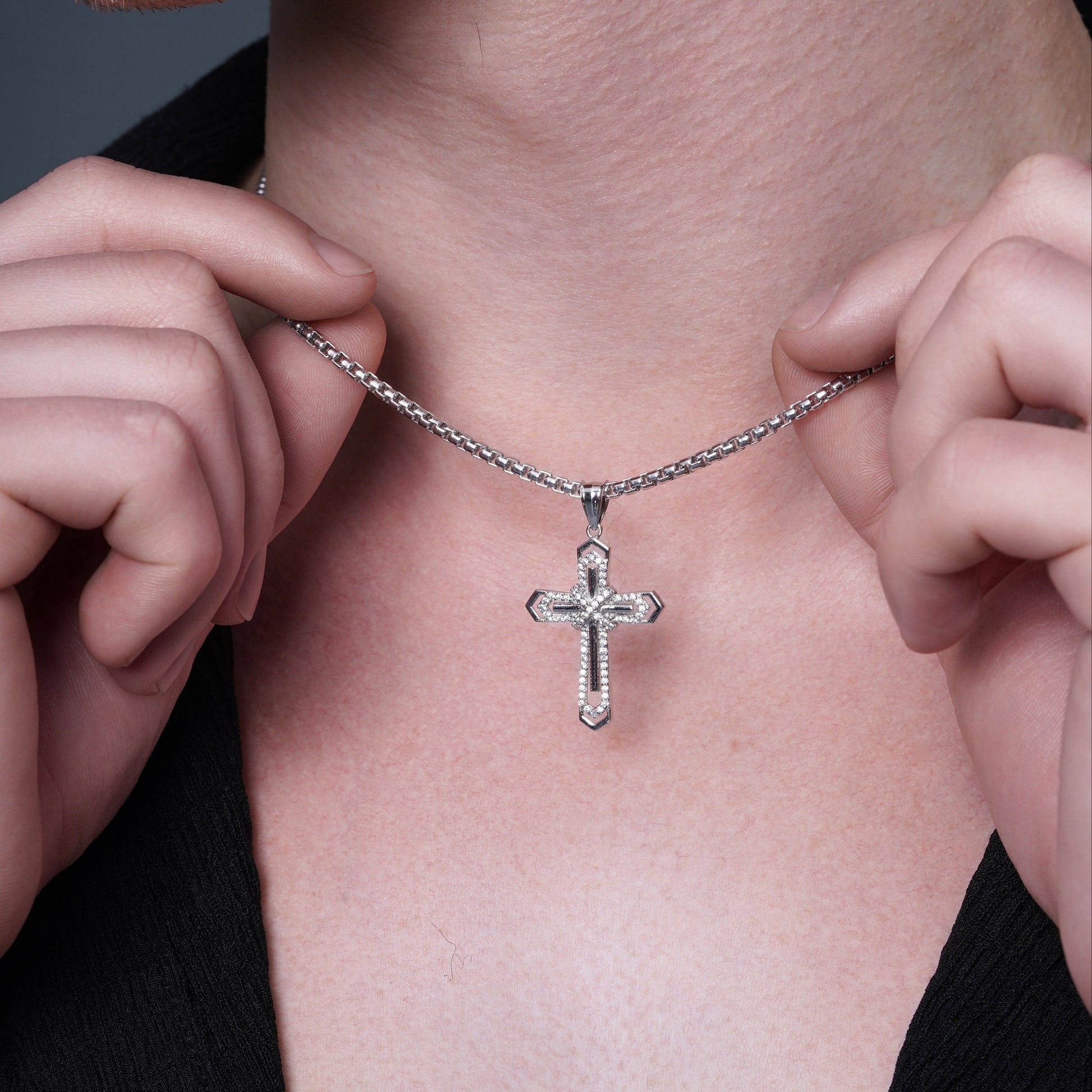 Add a touch of elegance and faith with our Rhodium Plated Crucifix Pendant. Made of 925 Sterling Silver, this layered cross features a unique arrow edge and sparkling Clear CZ stones. Perfect for everyday wear or special occasions. Get yours now!