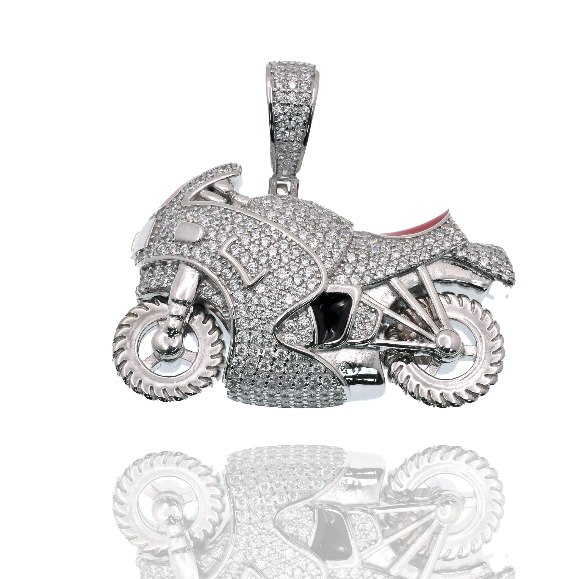 This distinctive 39mm x 25mm motorcycle pendant combines premium 925 Sterling Silver with meticulous rhodium plating for exceptional durability and shine. Featuring vibrant red enamel detailing and precision-set clear cubic zirconia stones in an "iced out" design, this pendant delivers remarkable visual impact. The rhodium finish ensures superior tarnish resistance while enhancing the brilliance of the CZ stones, making it an ideal statement piece for motorcycle enthusiasts seeking luxury craftsmanship.