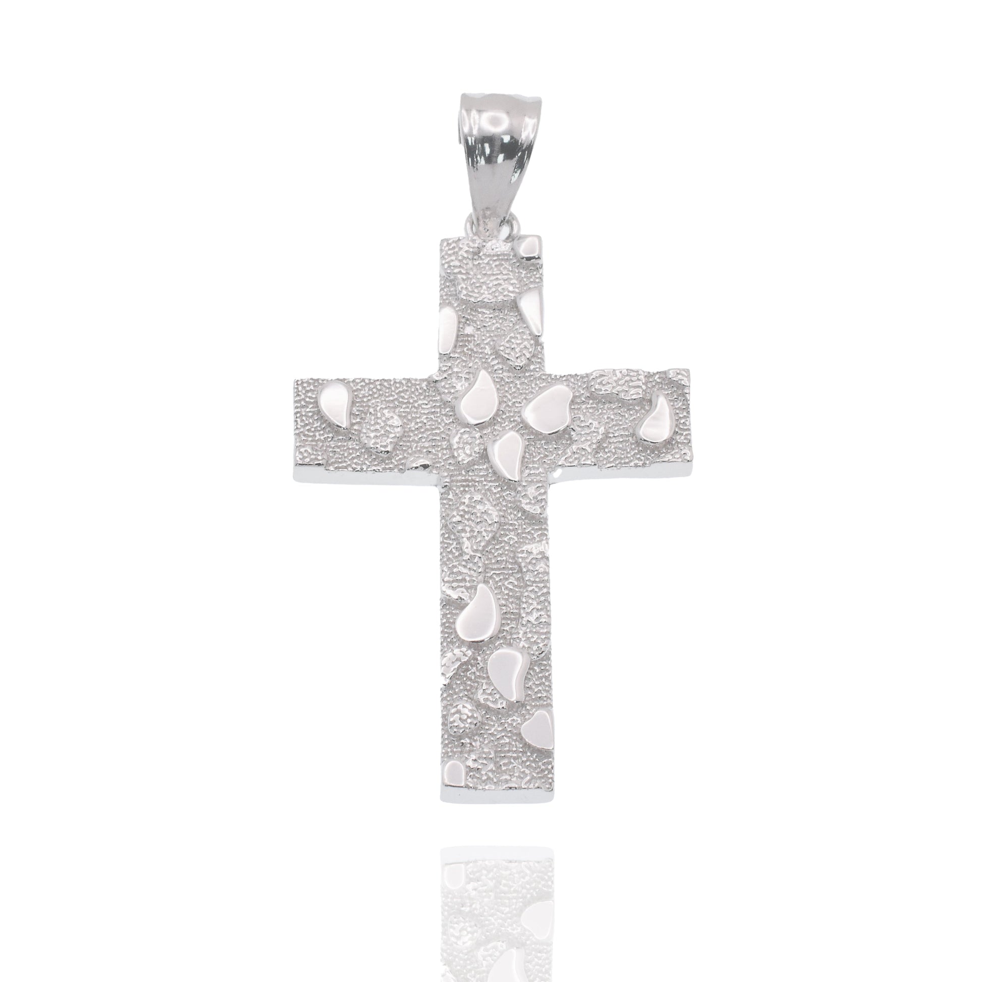 Take your style to the edge with our Rhodium Plated Sterling Silver Nugget Cross Pendant! Made with 925 sterling silver, this pendant features a unique nugget design and is coated with rhodium for extra durability and shine. Stand out and embrace your boldness with this daring piece!