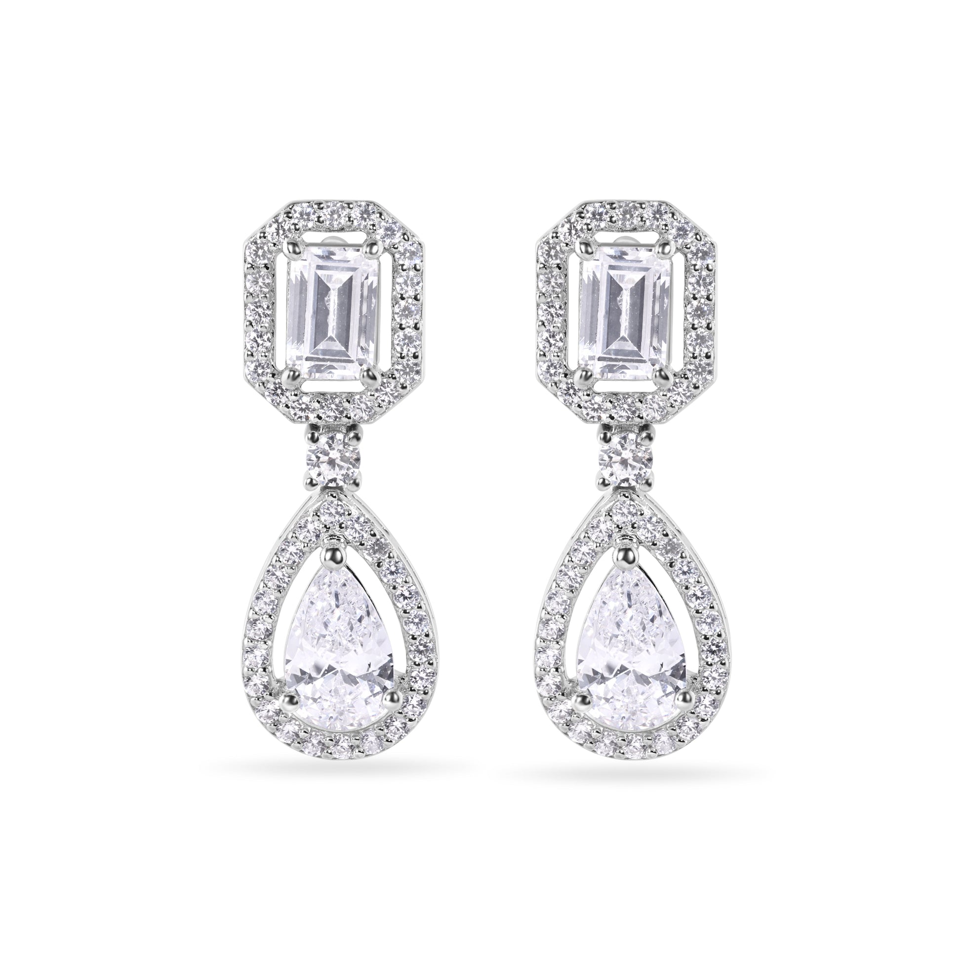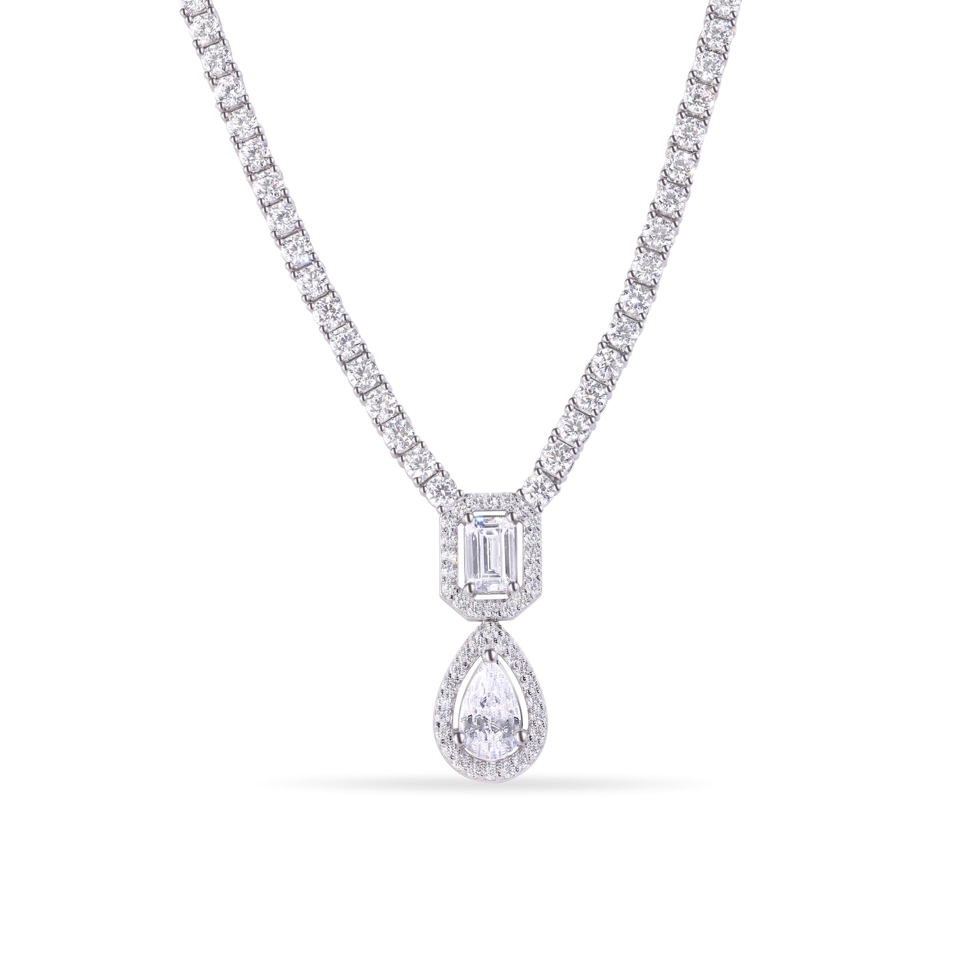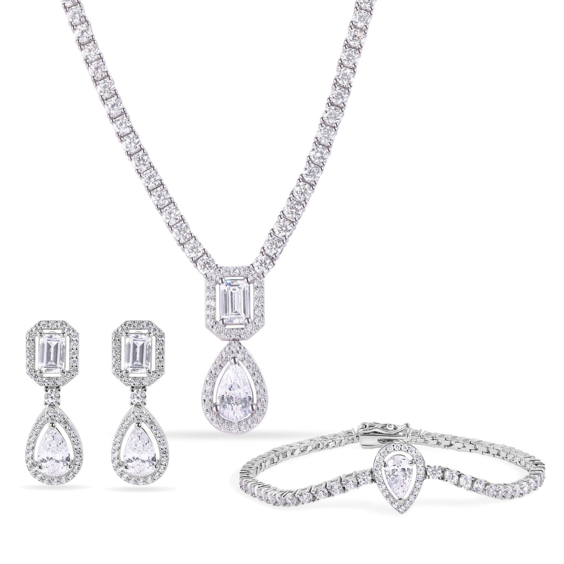 Rhodium Plated 925 Sterling Silver Pear Cut Center Stone Clear CZ Tennis 2.6mm Necklace Bracelet and Dangling Earring Set - GMS00032