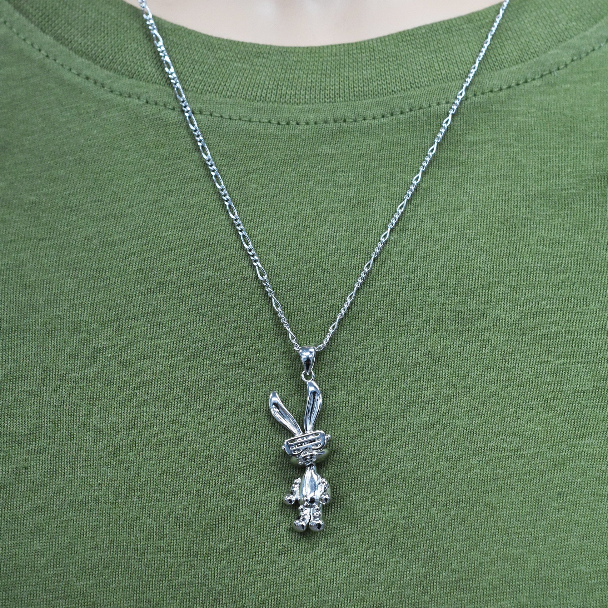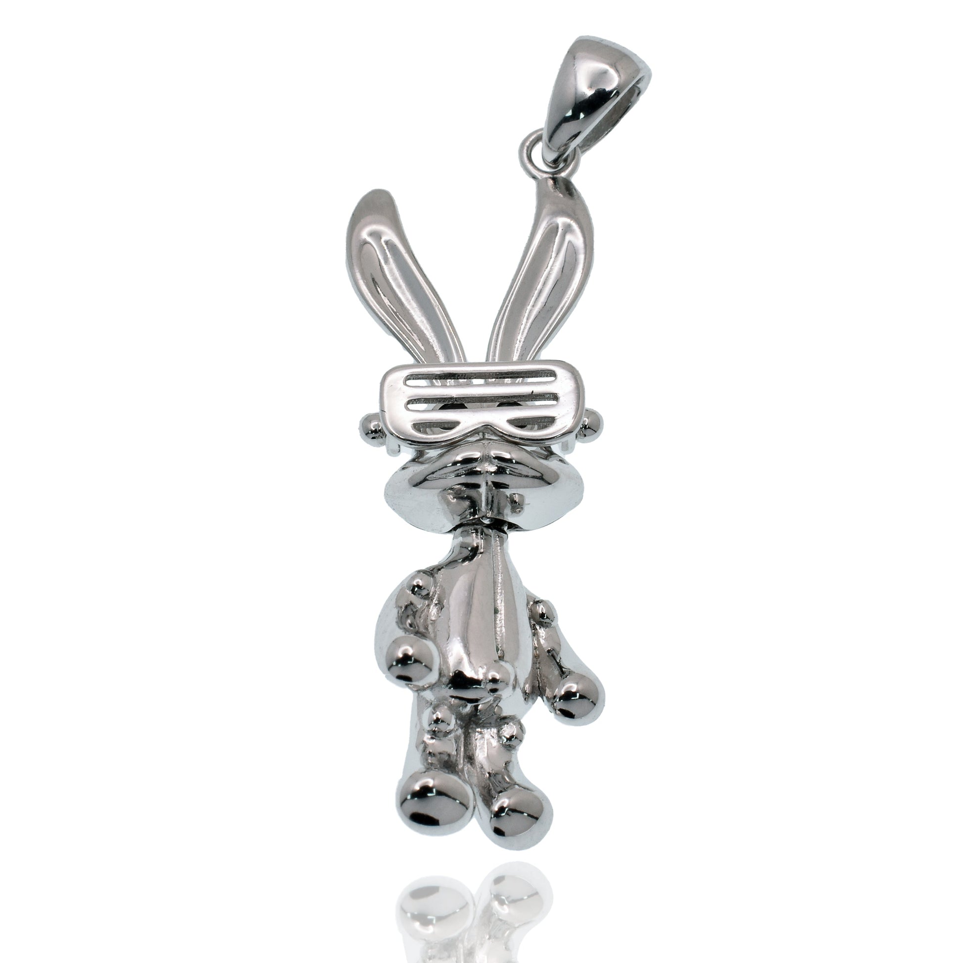 This sophisticated Rhodium Plated 925 Sterling Silver pendant showcases a playful rabbit wearing sunglasses, elegantly accented with black cubic zirconia stones. Measuring 10mm x 33mm, this distinctive piece combines whimsical charm with premium craftsmanship. The rhodium plating provides exceptional durability and a brilliant silver finish that resists tarnishing, ensuring this unique pendant maintains its lustrous appearance through regular wear.