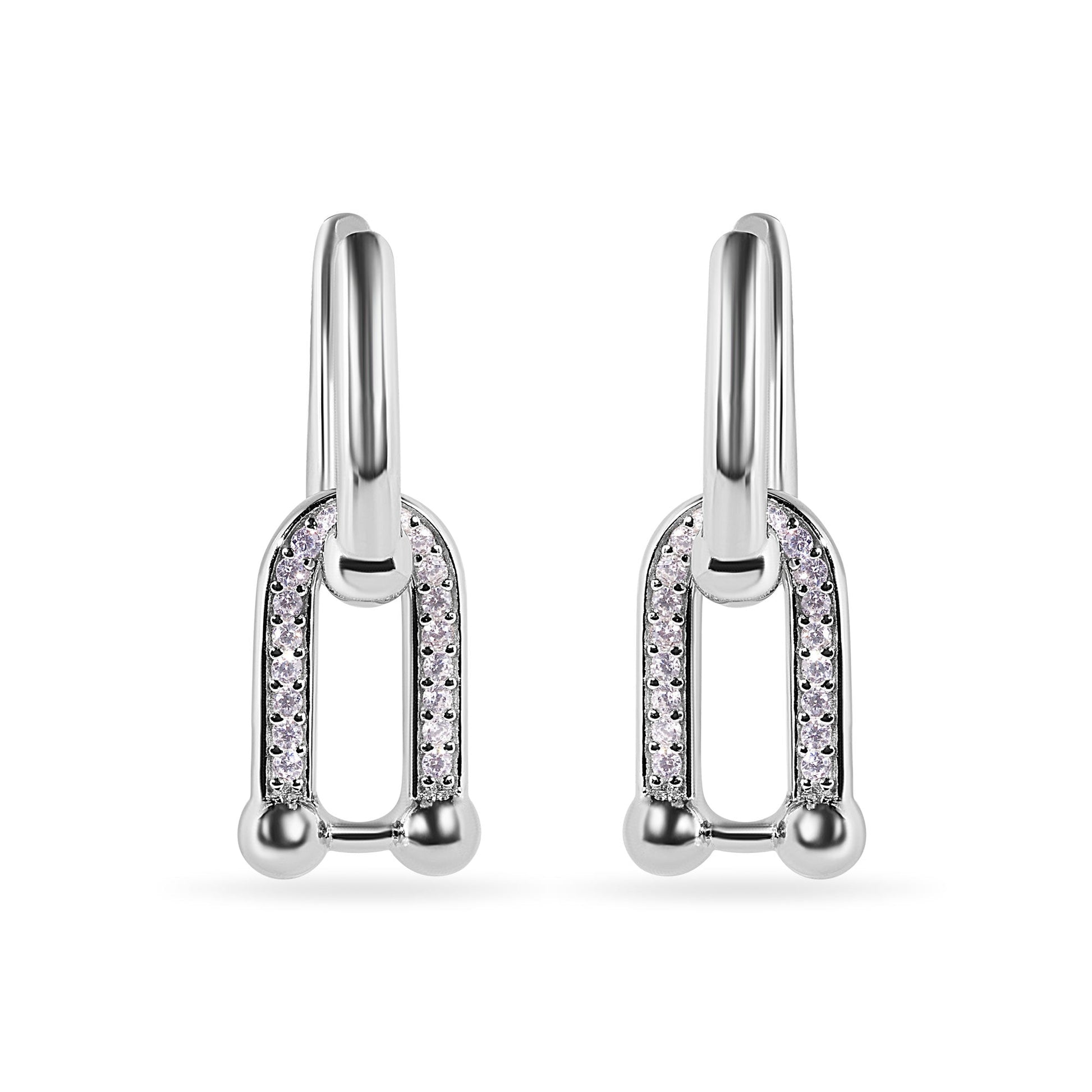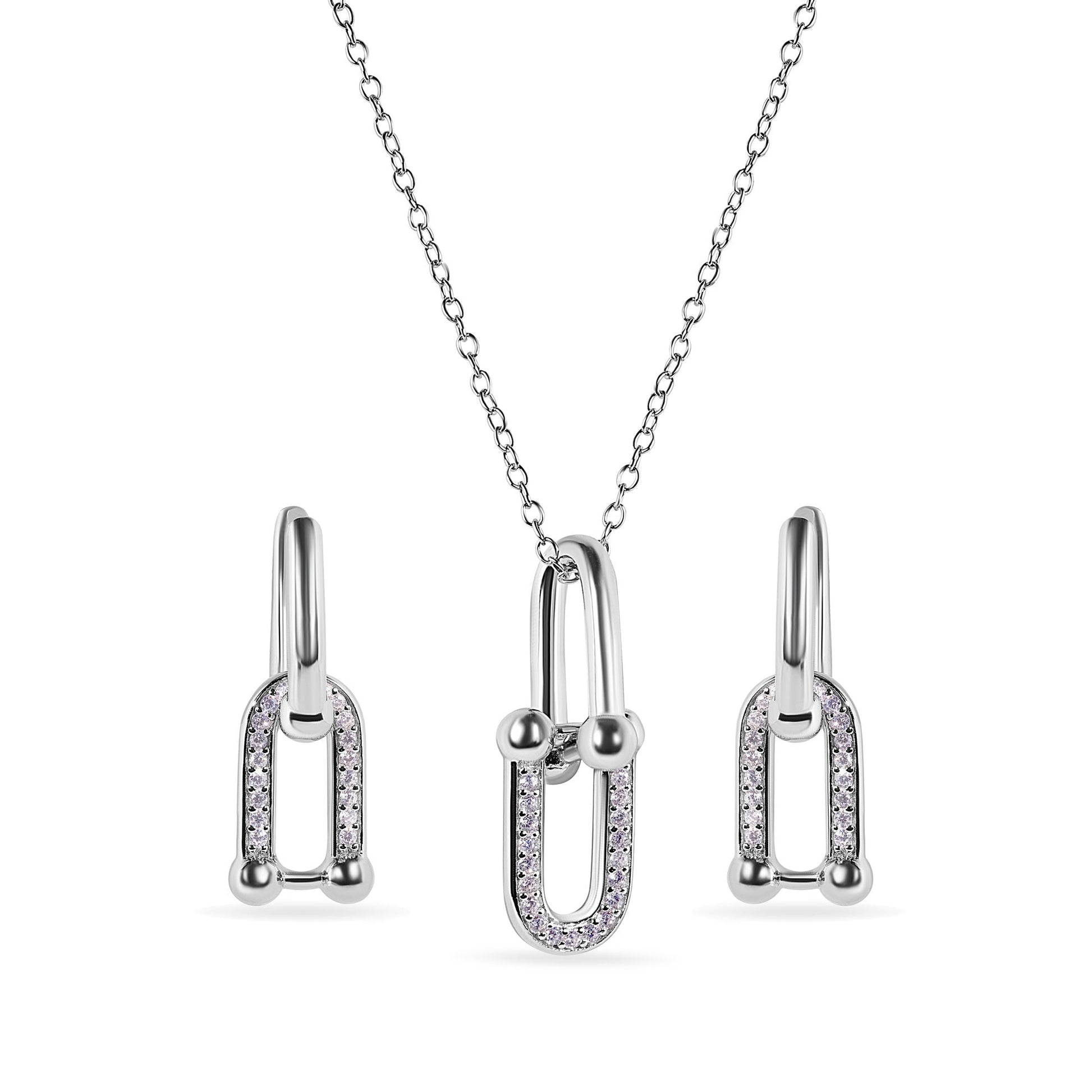 Rhodium Plated 925 Sterling Silver Round Bow Paperclip Clear CZ Necklace and Hoop Earring Matching Set - BGS00629