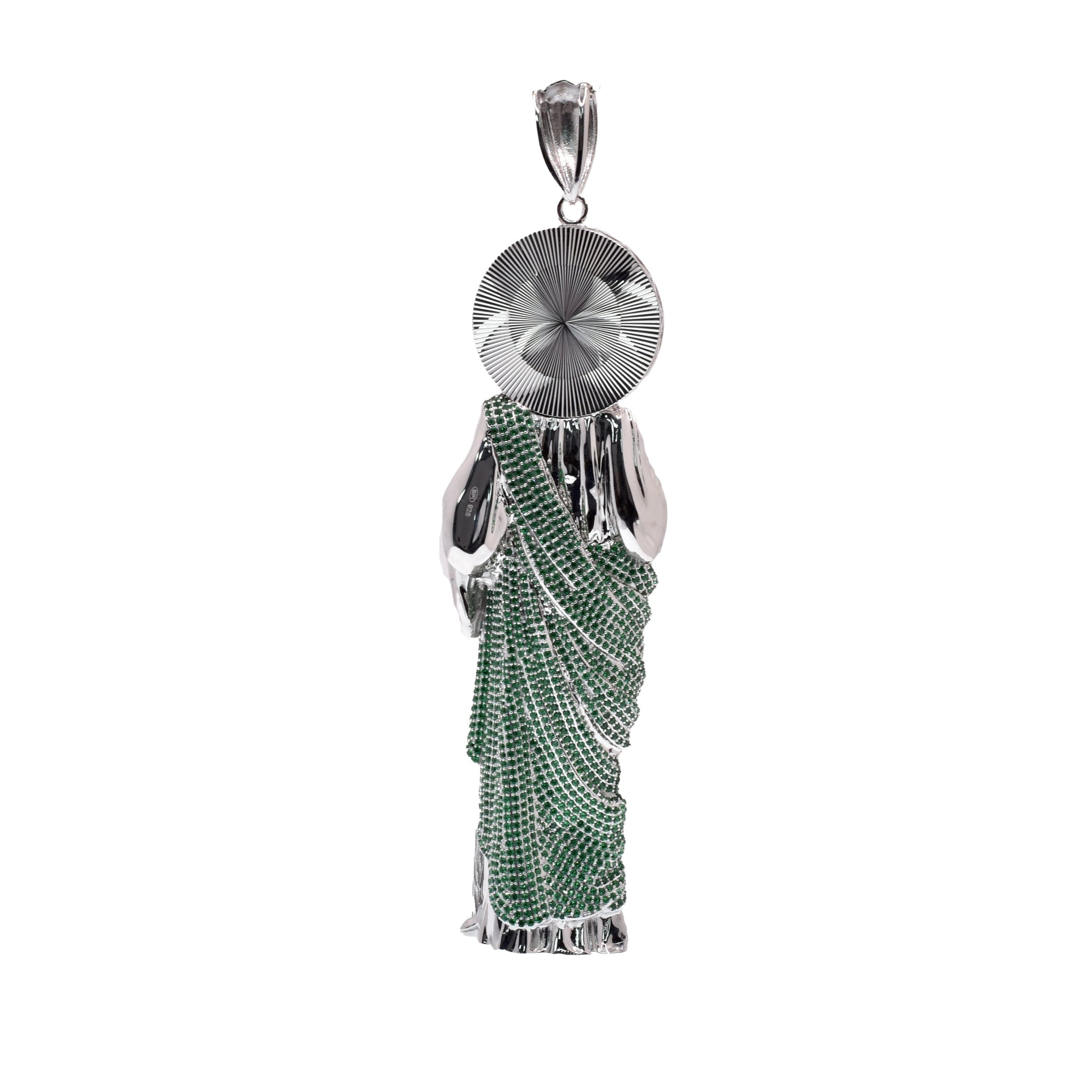 Crafted from rhodium-plated 925 sterling silver, this Saint Jude pendant features dazzling clear baguette and vibrant green round cubic zirconia stones. Measuring 57.1mm by 177.8mm, its impressive size and intricate design make it a standout piece. Perfect for those seeking both elegance and spiritual inspiration, this pendant adds a meaningful sparkle to any ensemble. Durable and radiant, it’s an ideal accessory to express faith while enhancing your style with lasting brilliance.