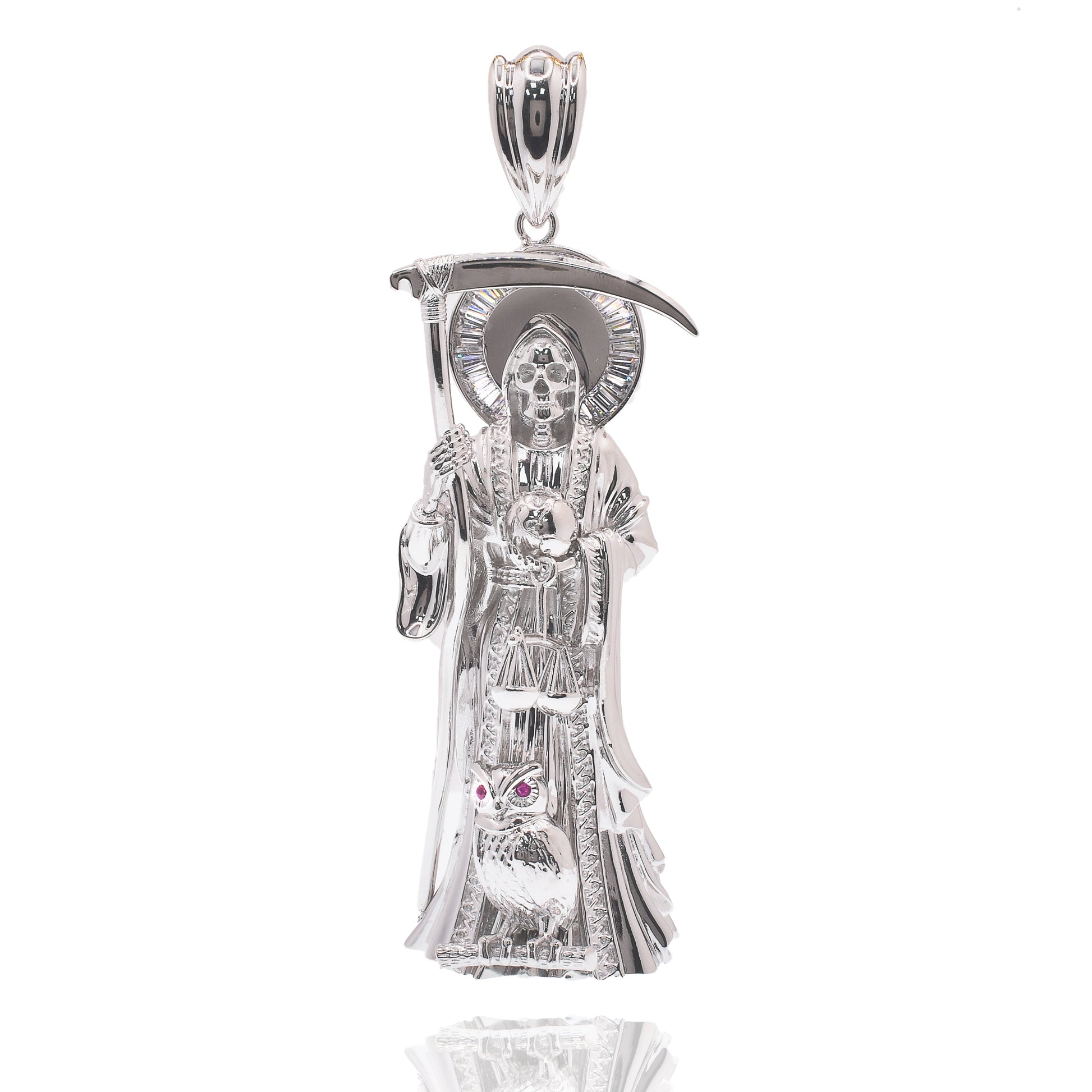 Expertly crafted from rhodium plated 925 sterling silver, this Santa Muerte pendant features precision-set baguette clear cubic zirconia stones for maximum brilliance. Measuring 51mm x 140mm, this substantial piece combines religious symbolism with premium materials, ensuring both spiritual significance and lasting durability through the protective rhodium coating that prevents tarnishing.