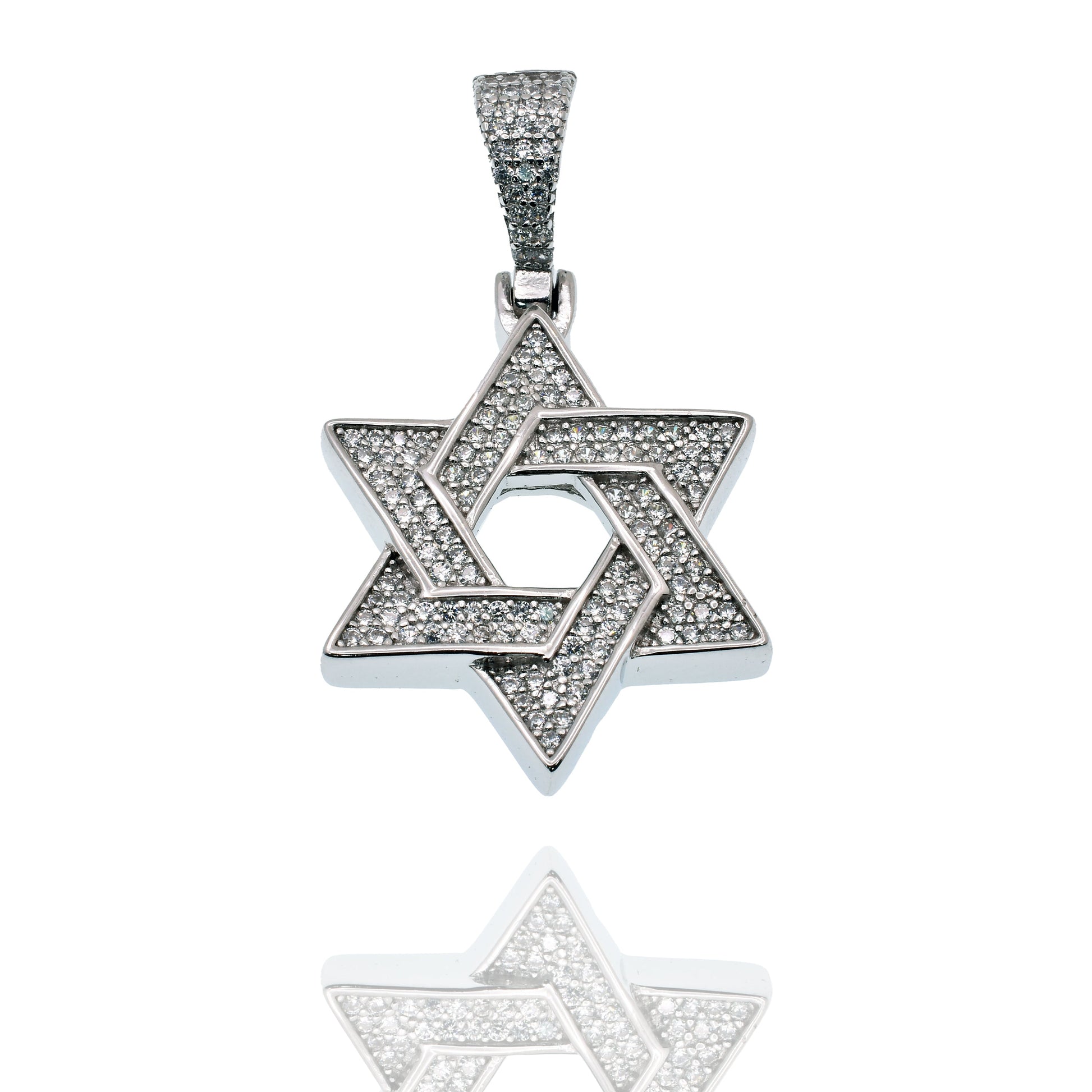 This sophisticated Rhodium Plated 925 Sterling Silver Star of David pendant features a fully "iced out" design with premium clear cubic zirconia stones meticulously set throughout its 23mm frame. The rhodium plating provides superior tarnish resistance while enhancing the pendant's brilliant luster and durability. This expertly crafted religious symbol combines traditional significance with contemporary luxury, creating a statement piece that maintains its exceptional brilliance through regular wear while honoring Jewish heritage with refined elegance.